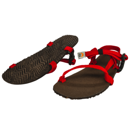 The straps go directly through the sole, thus creating a better angle of placement on the foot. The 5mm Vibram sole is very flexible and molds to the foot when first worn.